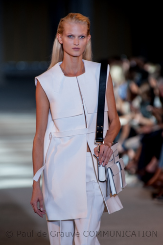 Come ci ha rivelato lo stilista nel backstage della sfilata, mostrandoci una modella vestita di una tutina corta con scollo a cuore e un cardigan aperto con una pioggia di cristalli ricamata sulle spalle, quello della Maison, per questa stagione, è un daywear sportivo e sartoriale illuminato da inserti in Swarovski. I tessuti riflettono questa scelta di praticità e couture, come il canvas insieme al satin, le mussole ed il pizzo, il lino ed il denim.