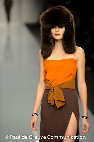 La sfilata di Ermanno Scervino per la p/e 2014 si è distinta per un’ atmosfera raffinata, data sia dall’eleganza dei capi che dai piccoli particolari del fashion show, come lo sfondo marittimo della passerella, un paesaggio dai colori morbidi e tenui. Le modelle hanno sfilato con abiti dai toni più eleganti come il kaki e il bianco e le tonalità più glamour di verde e giallo.