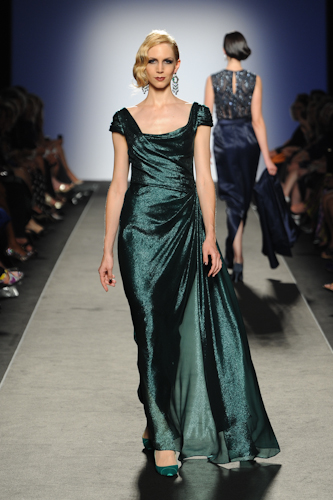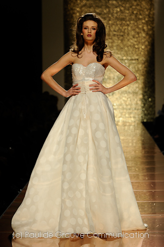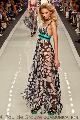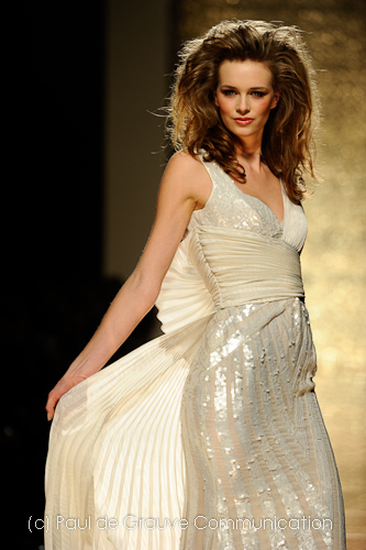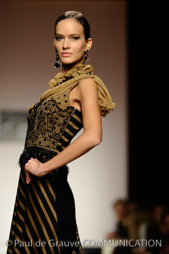Asymmetric strapless dresses, laser cut, collar neck back cleavage with cornely stitching and flowing double layers,which seems to accompany model’s movements, giving a sense of lightness and harmony, for a very sensual woman.