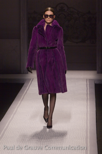 For the second look, eyelashes are painted with an acrylic paint. Lips are still matte, but in a deep colour. Base makeup is the same as above, as for highlighting he used a pigment mixture, creating a triangle between the outer corner of the eye and the cheekbone. This time the mask is black, for a super glamour effect.