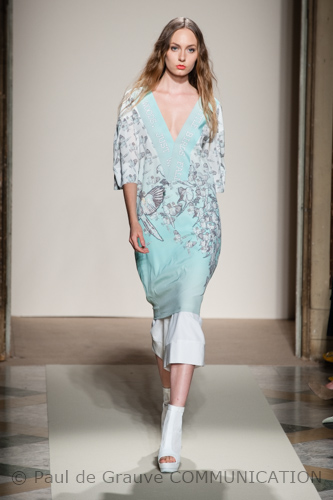 Characteristic games drapes on mini and long dress, blouses and skirts, all in fluid fabrics and shiny, to point out the romantic side of the collection.