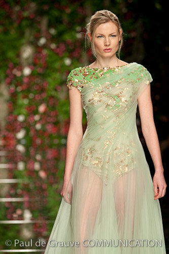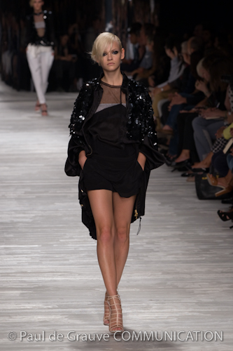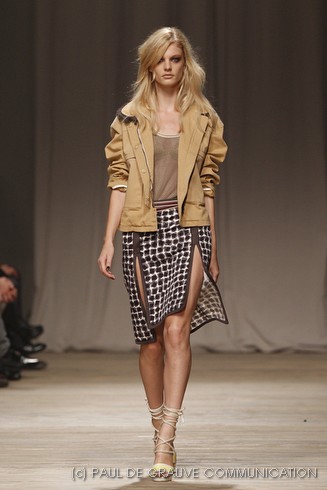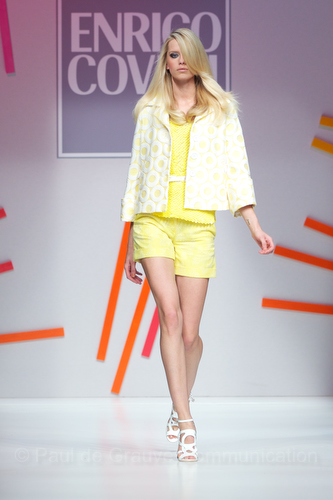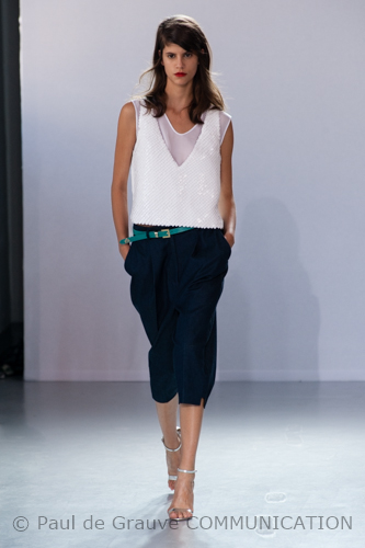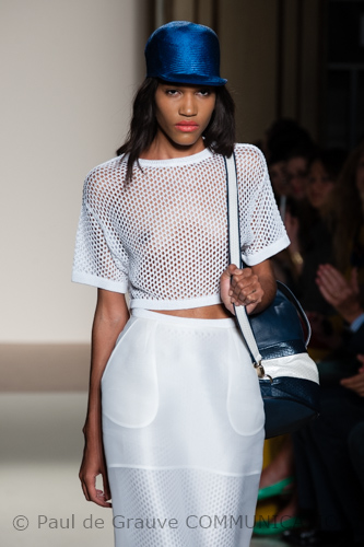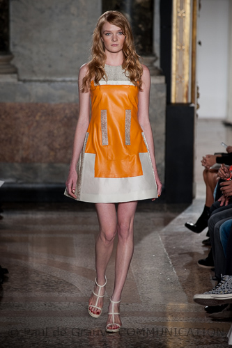 The dresses resound the Courreges of ’60, with cuttings and silhouettes well defined, and use a modern mix of fabrics: Jacquard of silk and cotton, fil coupe of organza and cotton, linen and chiffon, games of knitting and processed yarn.
