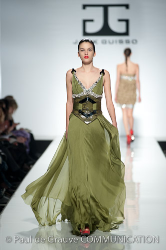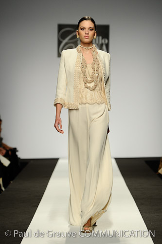 Evening dresses are long, slender and feminine silhouettes. Colors are dark, black matched with gold and silver. Extreme and provocative necklines, to give a sensuality touch.