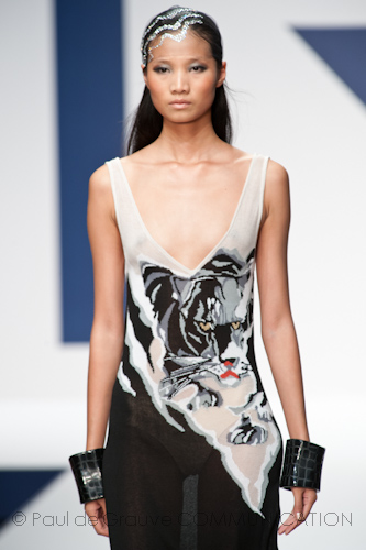 In un’alternanza di lunghezze, compaiono short cortissimi, gonne al ginocchio dallo spacco vertiginoso e maxi abiti che scivolano lungo tutto il corpo, fasciandolo. Profondi e audaci scolli a v rimarcano la femminilità che attraversa ogni creazione, accentuandone la sensualità. Per la donna viaggiatrice Krizia ha pensato ad una elegantissima sahariana dalle maniche in organza e a tuniche di camoscio color caffè e in pelle dorata. Alle amanti dell’avventura è dedicato il completo di seta stampata mimetica, da indossare in un ideale safari metropolitano. Non mancano citazioni da terre lontane, giungle e deserti: scaglie di coccodrillo che impreziosiscono i capi, stampe animalier, ricami così lievi da diventare piume; pitoni, puma, pantere stampati sulle maglie e tucani di paillettes ricamati sugli shorts da sera.