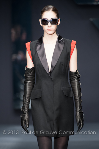 È una moda che veste una donna dall’apparenza aggressiva e combattiva che nasconde le sue fragilità dietro seducenti armature, come i bustini di pelle nera traforata al laser, con nastri e strisce intrecciate. La pelle avvolge le forme nei pantaloni skinny alla caviglia o nella tuta total black da biker. Sono enfatizzati i volumi delle spalle che sono diritte nei capi in tessuto, rotonde in quelli di pelle, a pagoda d’ispirazione giapponese. Le giacche, i tailleurs, i cappotti si rifanno al guardaroba sartoriale maschile declinato al femminile. I pantaloni sono asciutti; gli abiti, di gusto couture, fluttuano nelle loro sete plissè; le scollature sottolineano l’eleganza della figura. La maglieria gioca su pieni e vuoti in un mix di lana e nylon; tricot avvolgenti diventano caldi cappotti lunghi.