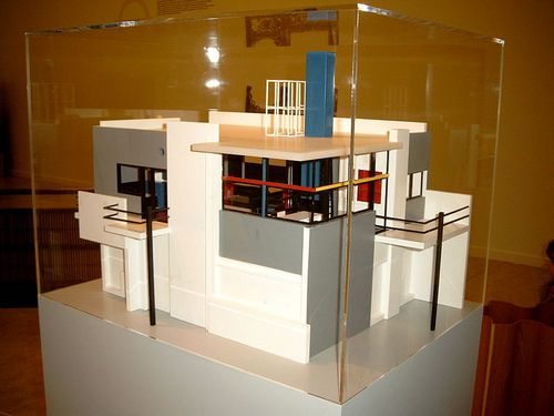 Composition with Red, Yellow and Blue del 1921 di Mondrian: astrazione, essenzialità delle forme e delle linee principalmente orizzontali e verticali, colori primari come il rosso, giallo e blu e i non colori bianco e nero, solo quadrati e rettangoli, in parole povere il superamento dai codici formali del classicismo e dalla convenzione della prospettiva rinascimentale. Così in architettura e nel design Rietveld si pone come un’anticipazione del Movimento Moderno, in particolare sulle ricerche astratte e sulle sperimentazioni della Bauhaus.