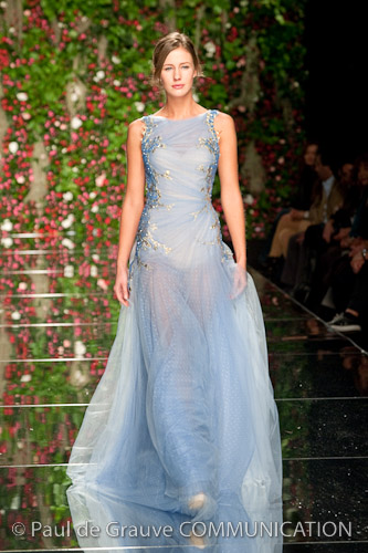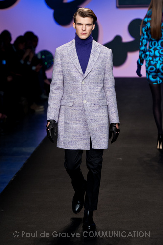 I colori dei capi riflettono questa scelta; la tonalità predominante è l’argento insieme con altre tinte luminose come il bianco, il verde menta, l’azzurro ed il perla. Le stampe sono realizzate in patchwork di coccodrillo, iguana e pitone, temi che da sempre caratterizzano la Maison Cavalli. Oltre ai più classici giacca e pantalone dal design regolare e semplice, lo stilista ha creato kaftani e sottovesti dalle tinte tie-dye le cui linee fluttuanti le immagini sfocate che scorrono sullo schermo di un cinema d’ antan.