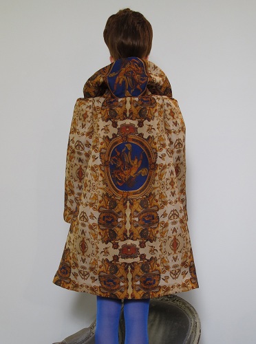 La prima creazione ad uscire in passerella è una giacca i cui motivi ripropongono i soffitti della sala Sistino: toni caldi, dove a prevalere è il marrone.