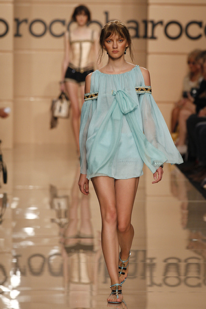 La sfilata di Ermanno Scervino per la p/e 2014 si è distinta per un’ atmosfera raffinata, data sia dall’eleganza dei capi che dai piccoli particolari del fashion show, come lo sfondo marittimo della passerella, un paesaggio dai colori morbidi e tenui. Le modelle hanno sfilato con abiti dai toni più eleganti come il kaki e il bianco e le tonalità più glamour di verde e giallo.