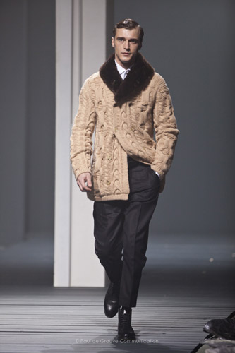 Particolare la giacca in maglia che si impone sull’intera collezione: adatta sia al giorno che alla sera, si ispira alla comoda giacca da camera, stretta in vita da una cintura dello stesso tessuto ma decisamente più elegante. Per l’uomo che preferisce un abbigliamento serale più classico la proposta è un blazer nero che per evadere dalla noia del “troppo classico” gioca con materiali insoliti come nappa e alpaca.