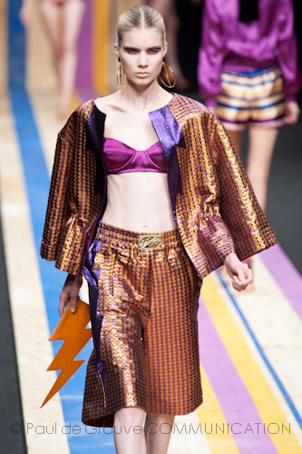 Questa collezione è dedicata ad una visione critica della nostra società, nella quale da un lato ci si prende troppo sul serio e dall’altro non ci si occupa con sufficiente serietà dei problemi che affliggono la nostra era, con quello ecologico su tutti. Non a caso la Westwood ha regalato a tutti i suoi invitati una bottiglia di alluminio da utilizzare e riutilizzare a modo di borraccia, per incitare al riuso evitando di consumare bottiglie di plastica (evitando lo smaltimento ed il riciclo). tornando agli abiti, con cui la stilista britannica ci racconta che con allegria e anticonformismo si possono abbinare quadri e righe, colori , stampati, disegni e graffiti. L’uomo Westwood della prossima primavera, è un anticonformista puro, un personaggio che non bada ai clichet, che utilizza bretelle sia su short che su pantaloni alti in vita e che lasciano rigorosamente la caviglia scoperta. Calze colorate, scarpe classiche ovvero stringate inglesi ma rivisitate in colori e rigorosamente spaiate. I modelli indossano parrucche per acconciature improbabili, ma che proiettano l’uomo pensato dalla Westwood in un mondo che definiremmo un po’ folle. Ma a volte un pizzico di follia serve a mantenere l’equilibrio.