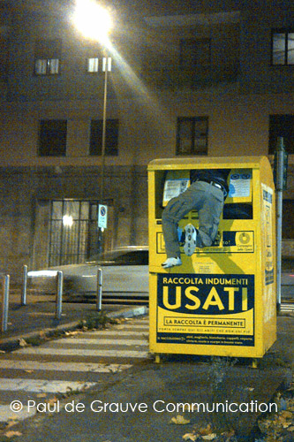 Milano : Il freddo spinge a saccheggiare i contenitori per la raccolta di abiti usati - ph: Paul de Grauve