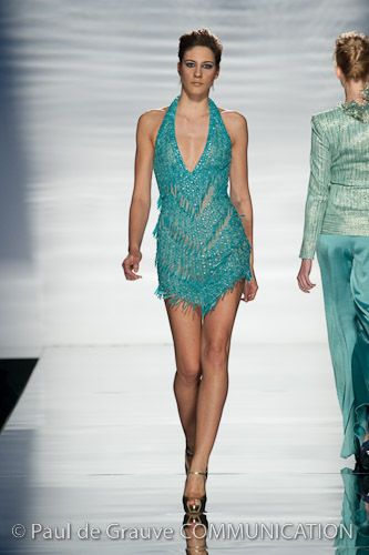 La collezione Edition Georges Chakra è stata interamente composta da abititempestati di gioielli e decorazioni di cristalli. Tessuti che ricordano pelle di medusa, corpetti e giubbotti voluminosi formati dasottili anelli di seta, da indossare anche con una maglietta e jeans. Una sfilata che ci è piaciuta moltissimo per una collezione “preziosa”.