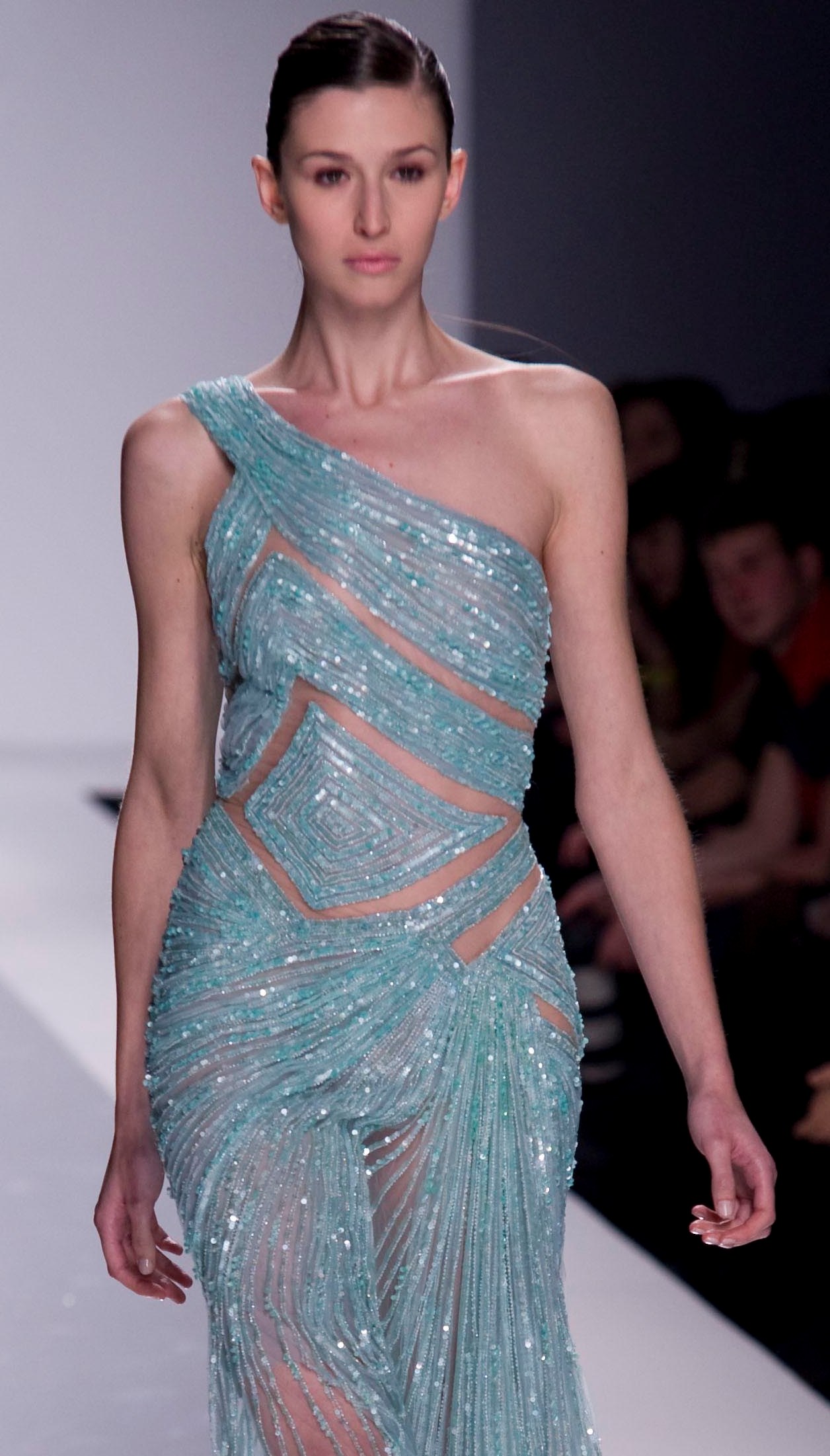 Poi, il colore del mare: un gioco di “vedo non vedo” fatto di trasparenze e ricami geometrici; oppure un mini dress celeste impreziosito da piccole roselline, da scie argentee lungo la schiena e da altri inserti silver nascosti sotto ad un intreccio di tessuti e vere pietre preziose.