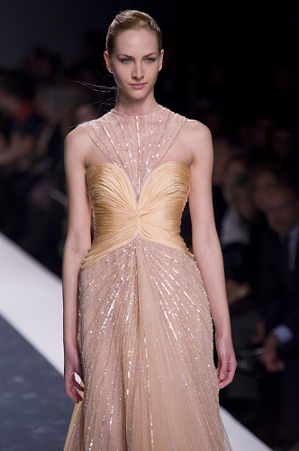 Graffi diagonali e lucenti all’altezza del corpetto rosa pallido, lavoratissimo, e cascata verticale di cristalli lungo le pieghe delle morbide gonne. Curiosa, se vogliamo, la scelta di abbinare una sottilissima cintura in pelle su abiti tanto importanti.