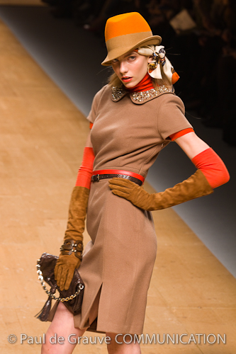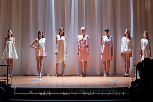 Abiti molto minimal, in cotone e seta con fibra d’acciaio che conferisce un effetto cangiante e stropicciato. Sensuali i dress monospalla che scivolano sul corpo in drappeggi rosa e lilla. Le scarpe, piatte e a punta, sono discrete, tanto da passare nell’insieme del look in secondo piano.