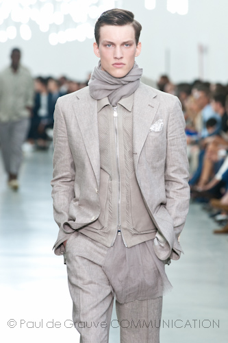 Rimane quindi la giacca formale ma completamente destrutturata, realizzata in maglia di cotone e portata sotto una sahariana di nappa o indossata con le maniche disinvoltamente arrotolate. Trench leggeri in nappa traforata a laser, portati aperti sull’abito per sdrammatizzarne l’eleganza con ricercata spontaneità, si alternano a giubbotti in camoscio di taglio più sportivo su pantaloni dalle linee morbide e dalle trame che evocano freschezza. Dettaglio immancabile e indispensabile la sciarpa dai tessuti impalpabili e coordinata all’abito, annodata al collo e lasciata maliziosamente uscire dall’estremità inferiore della giacca o della maglia. C’è in tutta la collezione una predominanza di colori chiari nei toni freddi, dal grigio perlato al total white.