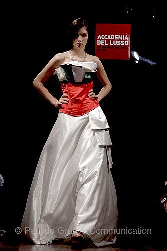 Il seminario che si è concentrato sul confronto tra di loro di sociologi , stilisti, designer e aziende che nel dibattito hanno arricchito il bagaglio culturale dei partecipanti , dando interessanti spunti ed approfondimenti. Il secondo è stato il momento sfilata nel quale tutti gli studenti di Accademia del Lusso, hanno presentato i loro lavori attraverso una sfilata celebrativa sul tema dell’Unità d’Italia e del suo centocinquantenario . Abbiamo visto tanto impegno e qualche spunto interessante. Sicuramente questi ragazzi sono ancora troppo giovani per sbalordirci con creazioni mozzafiato, ma di sicuro il mestiere lo hanno appreso bene e ci sanno fare. Interessante poi è stato osservare come studenti delle diverse sedi italiane di Accademia del Lusso, abbiano interpretato con sensibilità diverse e diversi background culturali il tema dell’unità d’Italia.