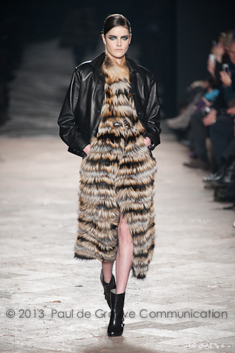 La pelliccia è protagonista indiscussa della linea, quale capo versatile, multifunzionale, facile da indossare sia di giorno che di sera. Le linee sono essenziali, impreziosite dai tessuti e dai dettagli; la femminilità è esaltata da accostamenti e sovrapposizioni tra sensuali aderenze e volumi over, tra lunghi e corti. Il gilet di pelliccia è il passe-partout della stagione: corto o lunghissimo, si indossa su camicie in chiffon dal collo alto, su pantaloni in lana