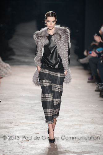 pettinata con disegni tartan, si combina con altri capi, come la giacca di ispirazione militare. I tessuti sono di pregio: visone, volpe, mongolia, zibellino, kidassia e cavallino maculato, anche combinati tra loro su una base di seta attraverso lavorazioni e intarsi artigianali; sono abbinati alla pelle, morbidissima, declinata in gonne corte plissettate, in abiti aderenti a tubino, in top smanicati, in black dress di nappa e pizzo, in pantaloni skinny alla caviglia o lunghi e morbidi.