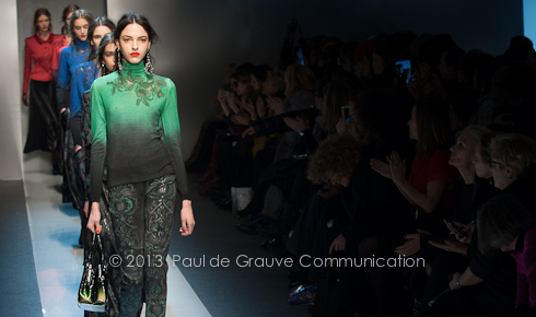 Se il giorno è dominato dai grigi e dai neri, la sera cede ai colori: elegantissimi gli abiti monospalla nei toni corallo, smeraldo e zaffiro. Il contrasto con il giorno è sottolineato dalla presenza dei volumi più vaporosi delle gonne e dalla ricchezza dei dettagli; in oro e argento le lunghe gonne plissettate da abbinare a giacchine monocolore.