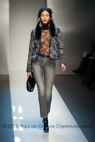 Ciò che sorprende è il sapiente utilizzo di dettagli e ricami, che, inseriti nel rigore della collezione, ne smorzano la severità, senza cadere in eccessi. Grafismi damascati e dal guizzo rinascimentale stampati su giacche, top e pantaloni, movimentano i capi; l’applicazione di piccole pietre illuminano i tessuti.
