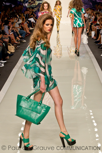 L’ispirazione è alle favole mediorientali, quelle da “mille e una notte” , come una moderna Sherazade , la donna Roccobarocco incanta per decisione nelle scelte e fascino comunicativo. E’ l’Arabia vista con gli occhi di un romantico viaggiatore di inizio secolo scorso, abbagliato da colori e aromi inediti. La passerella si apre con i colori forti e primari del giallo, rosso, verde con declinazioni al fucsia (colore della stagione) e al turchese. Non mancano il bianco ed il nero ed il beige.