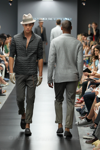 E nelle mezze stagioni i pull diventeranno trapunte tecniche leggerissimi chiuse da zip, alternativa a trench e cabanne di ispirazione militare. Porterà pantaloni morbidi ma asciutti, anche a vita alta, nei colori sfumati e degradé; più formali se con la piega realizzati in seta a micro disegni di ispirazione cravatteria. Crespo di lana per gli smoking da sera in blu e bianco con reverse di faille di seta, mono e doppio petto, da indossare su camicie in cotone e cotone/seta, bianche candide, chiuse da papillon bianchi. Buona visione !