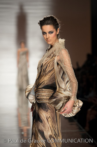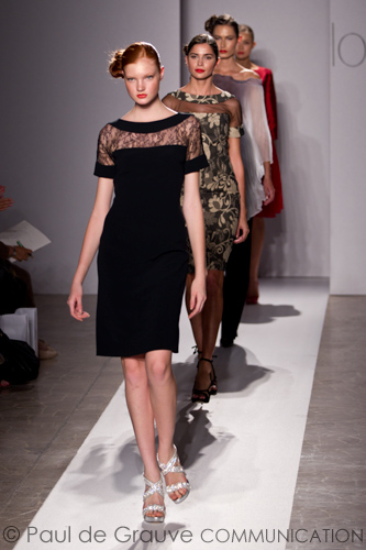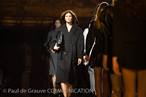 I colori in evidenza sono il bianco abbinato al nero, vaste declinazioni di grigio, sfumature metalliche del verde e del rosa pomplemousse. I materiali sono invece pelle, twill di seta, panno di lana e jersey.