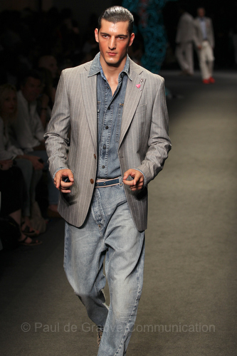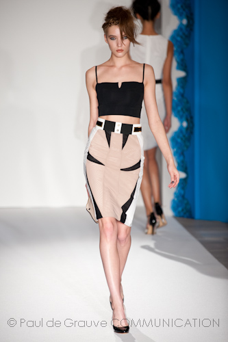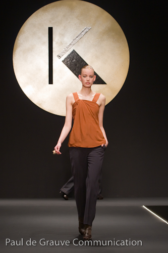 Ad una generale atmosfera di rigore viene contrapposta la dimensione emozionale del surrealismo che ritroviamo nelle stampe e nel simbolo, di freudiana memoria, del frutto aperto che amplifica il valore del percepito come fil rouge che accompagna la collezione. Un allegorico pompelmo rosa quindi è prima stampato su twill di seta, si stacca dagli abiti, si insinua nei drappeggi tridimensionali del jersey e culmina nel ricamo dell’abito finale, lungo, dove i grani del frutto diventano organi e appendici del corpo.