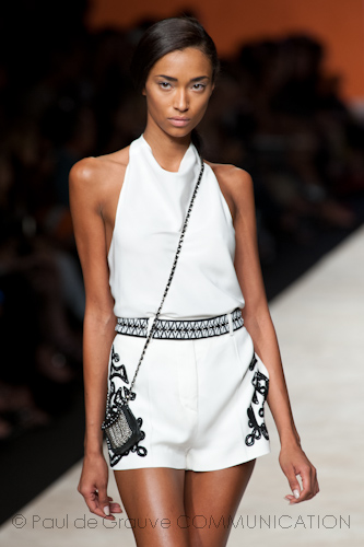 Bianchi e neri compaiono alla fine della sfilata in un ritorno ad una classicità rivisitata : negli abiti aderenti a formare motivi geometrici e nei parka dal collo retrò, intarsiati al laser. Ricordo di tempi antichi anche nell’uso di bottoni gioiello che, applicati a giacche traforate dallo scollo a barchetta abbinate a shorts che luccicano di paillettes, ritornano a vivere di una modernità nuova di gusto classico.