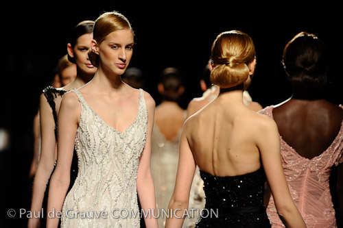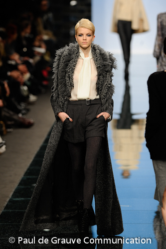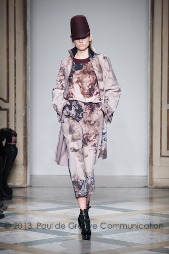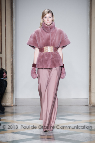 Abbiamo visto stampe esclusive su lana e seta, tridimensionalità, geometrie eleganti e definite, un gioco di sperimentazione riuscito nel coniugare materiali diversi come la lana e la seta, la pelliccia e la pelle con il cachemire. Come ci ha rivelato Sergei Ginko nella video intervista esclusiva per Modeyes TV, i colori sono presi a gruppi di tre, per effetti ton sur ton che utilizzano i bianchi, il pesca,il cipria, il bordeaux e il prugna. Immancabile il nero .