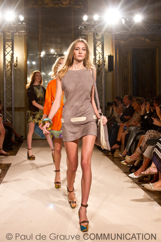 Abbiamo visto canotte, piccole giacche, micro boleri e mini-trench con tagli geometrici i colori sono i bruciati e i turchesi, incursioni di fucsia e arancio. Minigonne e microabiti, , maxi e pantaloni di cotone corposo a motivi optical: tessuti del Togo o del Benin, sono un vero e proprio lusso “equatoriale” anche perchè accompagnano l’emancipazione femminile nel Continente Nero. La produzione e la commercializzazione di questi tessuti ha consentito a molte donne di studiare ed arricchirsi. La pelliccia, specialità di casa Ravizza, diventa in questa collezione una citazione ironica e colorata : La canotta in zibellino, il mini visone arancio e il gilet in volpe ne sono gli esempi.