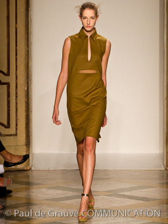 The dresses resound the Courreges of ’60, with cuttings and silhouettes well defined, and use a modern mix of fabrics: Jacquard of silk and cotton, fil coupe of organza and cotton, linen and chiffon, games of knitting and processed yarn.