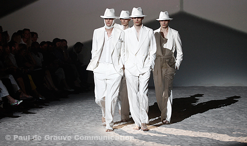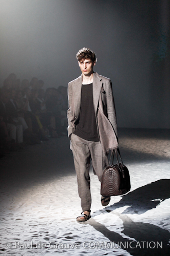 La seconda parte della sfilata, in netto contrasto con la prima, rappresenta un uomo sportivo e casual chic. Ispirato viaggiatore in un assolato e sabbioso deserto. I toni sono quelli naturali del beige e del marrone. Naturale anche la fibra utilizzata, l’abaca, una nuova fibra vegetale proveniente dalle Filippine, elastica , sottile, idrorepellente e in parte simile al lino.