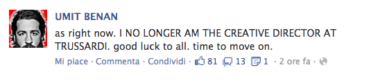 Umit Benan non è più il direttore creativo di Trussardi, lo ha annunciato lo stesso designer turco sulla sua pagina Facebook. Lo stilista aveva da poco presentato la sua collezione donna con Trussardi , per il prossimo autunno inverno 2013-14.