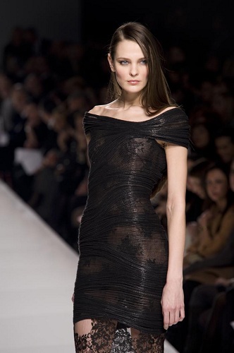Il primo abito a sfilare è un mini dress aderentissimo. La fame degli occhi è appagata da un orlo trasparente in pizzo. Oltre agli scolli vertiginosi che lasciano scoperta tutta la schiena, di notevole interesse è anche il mini tailleur bianco dai pantaloncini brillanti.
