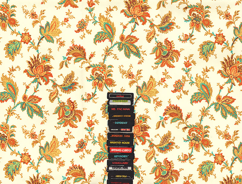 La carta da parati, con disegni tipicamente anni Ottanta, che Thornton mette come sfondo alla sua pila di videogiochi obsoleti, può rappresentarne un esempio. Potrebbe essere ciò che si ricorda della sua infanzia? Può darsi che sia così, di fatto è la sua personale elaborazione di un oggetto di cui sicuramente ha avuto esperienza diretta. Partendo da vecchie foto di famiglia e immagini della cultura pop, utilizzando una tecnica particolare che permette di trasferire i pigmenti su carta, l’artista americano sembra ridare modernità a ciò che è superato, in un’ideale continuità tra recente passato e un presente fin troppo fuggevole. È un tempo a cui non sembra guardare nemmeno con tanta nostalgia dal momento che lo fa rivivere in modo del tutto originale in un mix di tecniche vecchie e nuove in un’ineluttabile evoluzione. Forse è più lo spettatore che osservando le opere di Hollis ricorda gli anni dell’analogico con il sorriso malinconico di chi ha vissuto un’epoca che sembra distante anni luce.