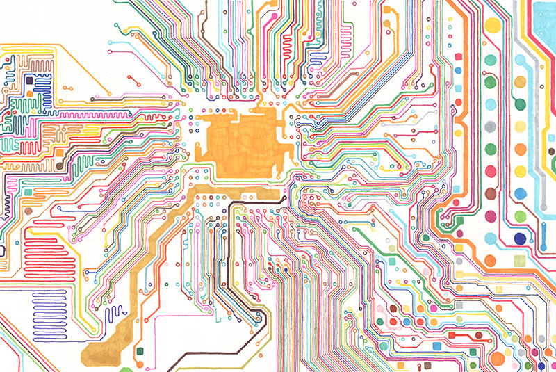 Per la generazione Internet questo è di puro interesse storico, il medioevo della tecnologia che si studia per conoscere il passato; per molti di noi che quell’era l’hanno vissuta è un insieme di ricordi, quasi sbiaditi. Per Hollis Brown Thornton è arte. Hollis è un artista americano della Carolina del Sud, classe 1976, che, avendo avuto esperienza diretta di quell’epoca, ha deciso di tradurre in opere il suo personale ricordo di questo recente passato. Il risultato è un’interessante produzione di opere (dipinti e immagini con pennarello) che hanno come soggetto gli oggetti simbolo dell’analogico, vhs, floppy disk, vecchi videogiochi Atari. L’idea di fondo, come filo conduttore che attraversa l’intera produzione dell’artista, è che la transizione è un elemento chiave, che molte cose importanti cambiano nel corso di una vita, che il senso di stabilità è illusorio.