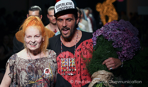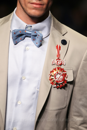 Non si sa se i modelli gocciolassero di sudore per l’aria condizionata spenta, nelle sale della Permanente di Milano durante la sfilata, o se fosse una allegoria voluta pensando agli atleti olimpici. E tra le sculture luminose di Marco Lodola , le medaglie e le coccarde fatte con le lattine Coca Cola, e le corone di alloro, la fiaccola sulle magliette sono alcuni dei simboli che osserviamo ripresi nella collezione. La creatività è quella tipica del brand. Irriverente, irrituale, incredibile come la Westwood. Arrivata a bordo di una fiammante Bentley, la regina della moda inglese ci tiene a sottolineare o meglio, Andreas Khronthaler ( marito della Westwood di 25 anni più giovane), ha deciso di riconoscere il suo reale ruolo di partner anche nel design, essendo a capo della linea uomo e facendo la passerella al braccio della moglie (VIDEO).